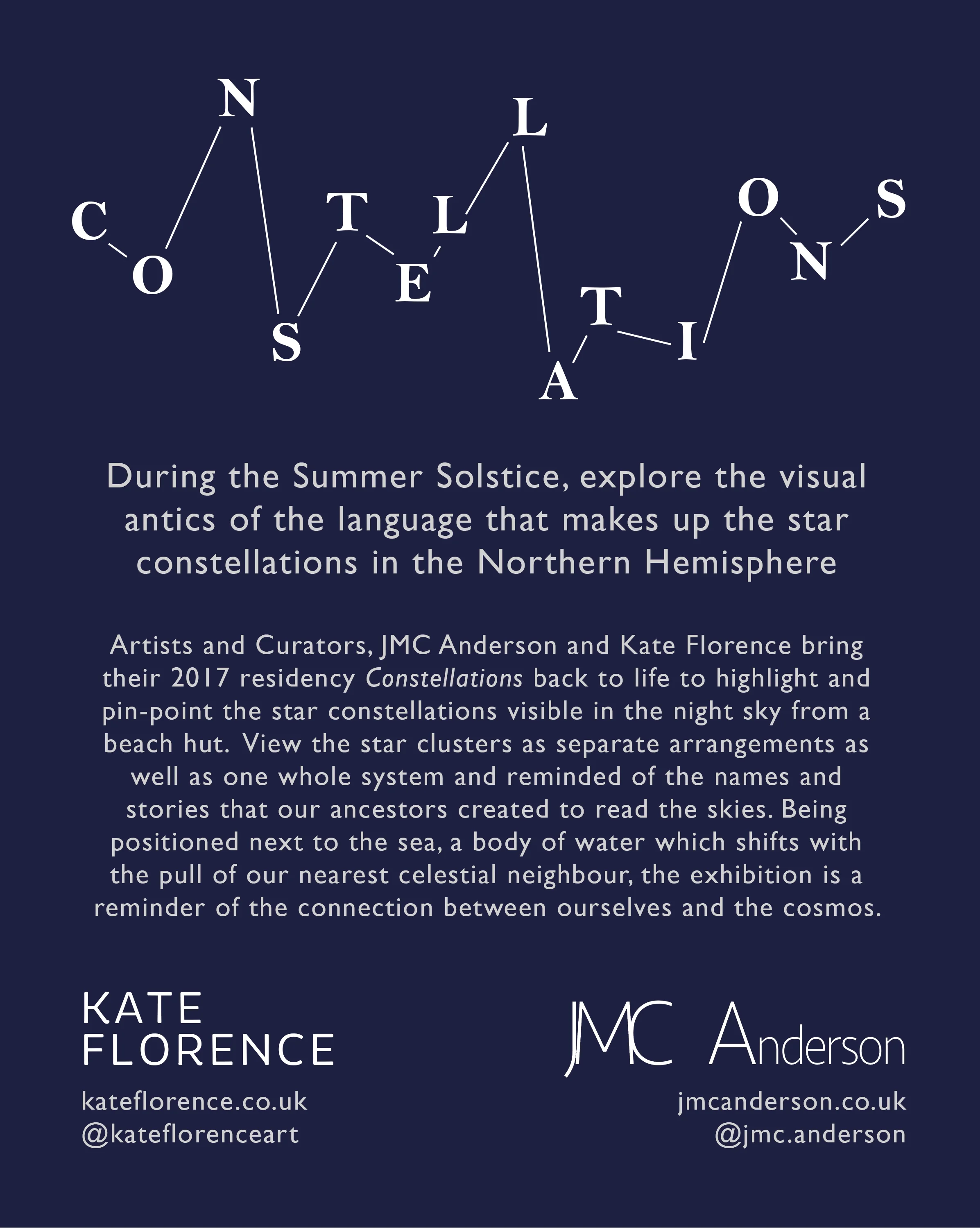 Constellations was a collaborative installation series with artist Jade Anderson, developed through a one-week residency at the Barber Shop (Dyad Creative) in 2017 and later reimagined as an immersive beach-hut commission for First Light Festival in 2019. Across both versions, the work explored how constellations are shaped through language, interpretation, and pattern-making, encouraging visitors to navigate the installation and discover the star systems through text, image, and projection.
